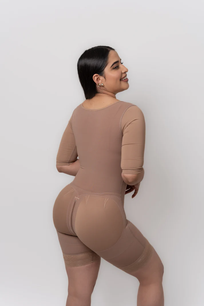 Ideal después de procedimientos como abdominoplastia, liposucción o cualquier cirugía estética. Diseñada para facilitar el drenaje, cuenta con cierre perineal para ir al baño sin tener que sacarla, senos libres y full levanta cola sin rellenos.