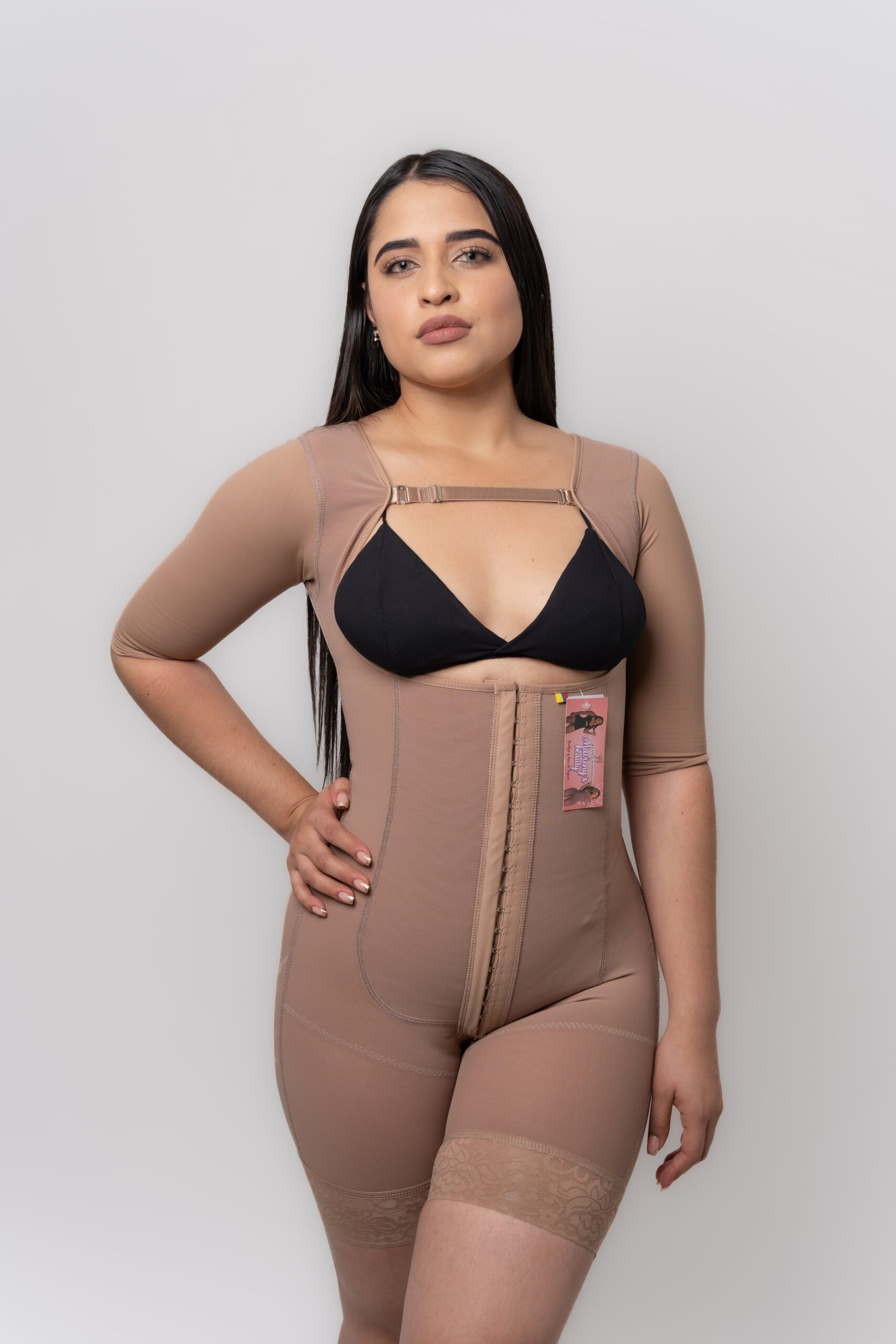 Con mangas ¾, tipo shorts con blonda siliconada para que no se enrolle ni se marque bajo la ropa y sistema de tres filas de broches ajustables, esta prenda asegura que tu figura se moldee gradualmente mientras tu cuerpo sana.